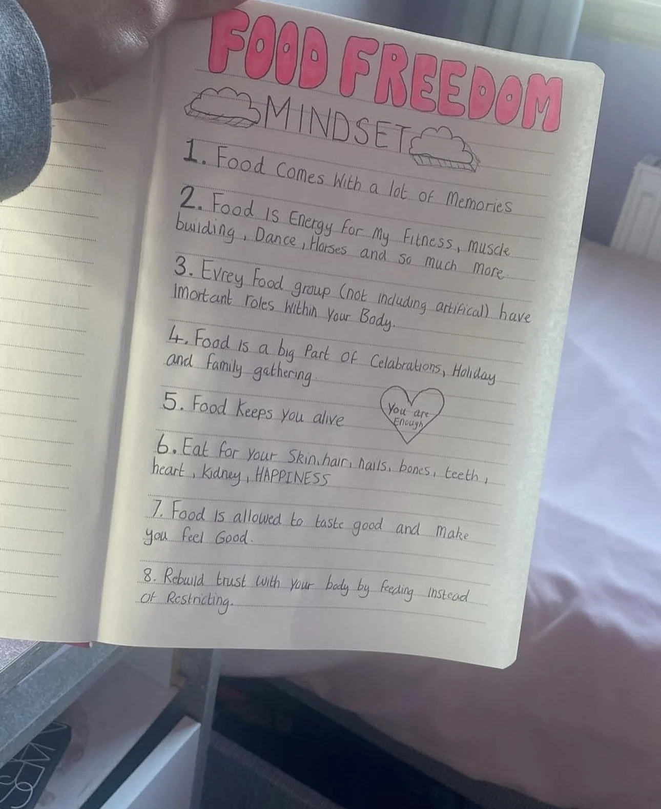 Putting healing first, while using tools & activities you can implement in the day to day. You’ll get weekly prompts, soul actions, and nervous-system-safe practices that rebuild trust, self-compassion, and identity outside of the ED.